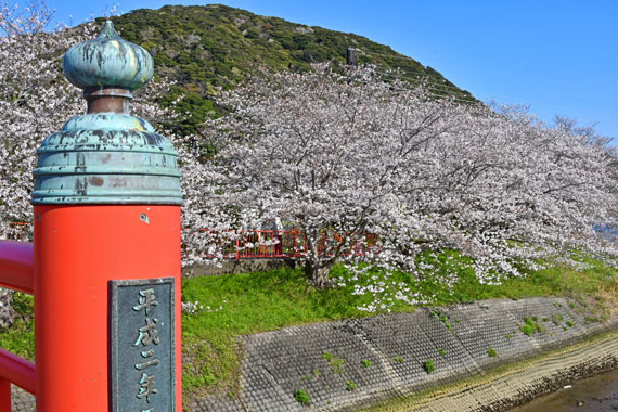 特に東側(県道16号側)、出会い橋(小さな赤い橋)から弓ヶ浜大橋までの歩道は桜のトンネルのようになっていて、伊豆の中でもトップクラスと言っても過言ではないほど素敵な桜並木といえます。