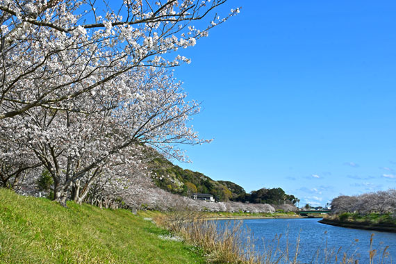 青野川の下流付近にかかる「日野橋」から「弓ヶ浜大橋」の間の堤防に、ソメイヨシノが約200本ほど並んでいます。