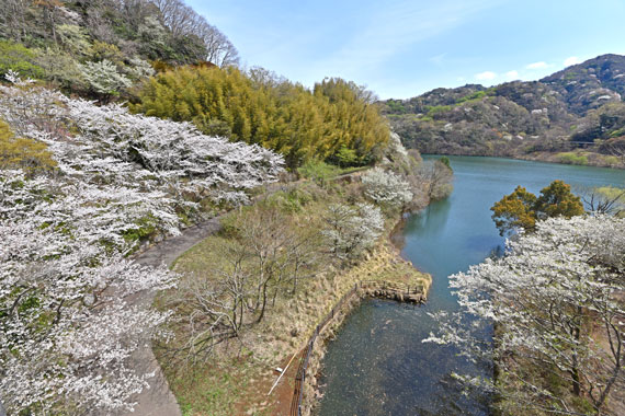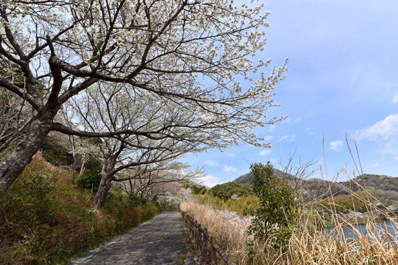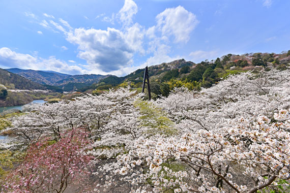 松川湖(奥野ダム)の湖周辺では、河津桜・城ヶ崎桜・ヤマザクラ・大島桜・ソメイヨシノ・八重桜など、時期によって様々な桜が咲いています。