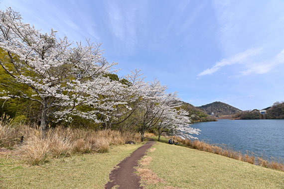 各種桜のそれぞれの本数はそれほど多くありませんが、湖畔周辺やバイパス道路沿いでは、山間を彩る桜景色が広がっています。