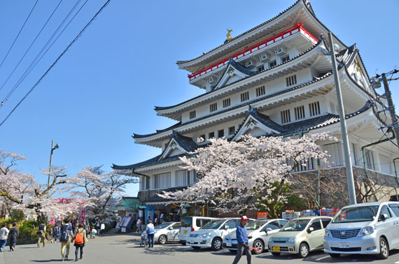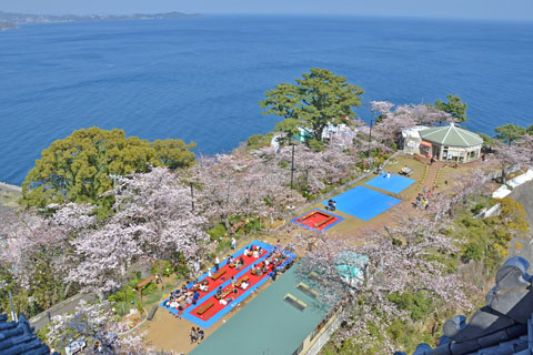 春の熱海城では、周辺も含めて約100~200本ほどの桜が咲き、多くの観光客や花見客で賑わいを見せています。