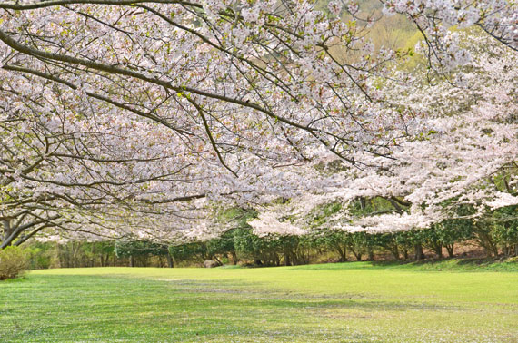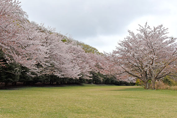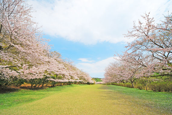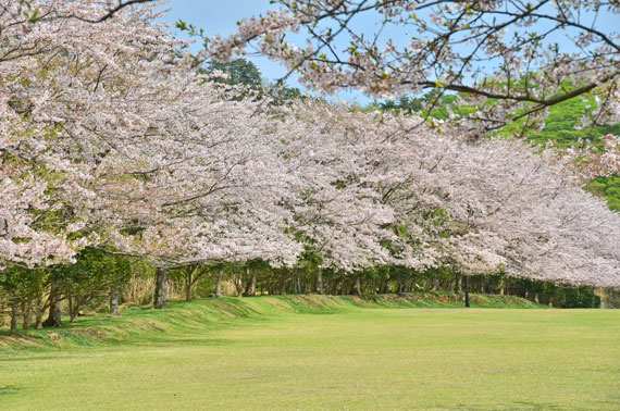 桜スポットとして知られているのは、スタート地点から約400m続く芝生の直線に咲く約110本のソメイヨシノの桜並木です。