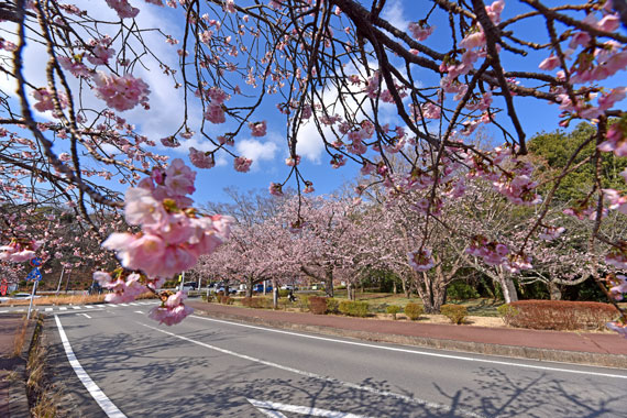 伊豆高原桜並木では、例年、3月上旬~中旬頃に伊豆高原駅前の「おおかん桜まつり(少し早咲きの桜)」から始まり、4月上旬頃にはソメイヨシノの桜並木が見事な景色を広げています。