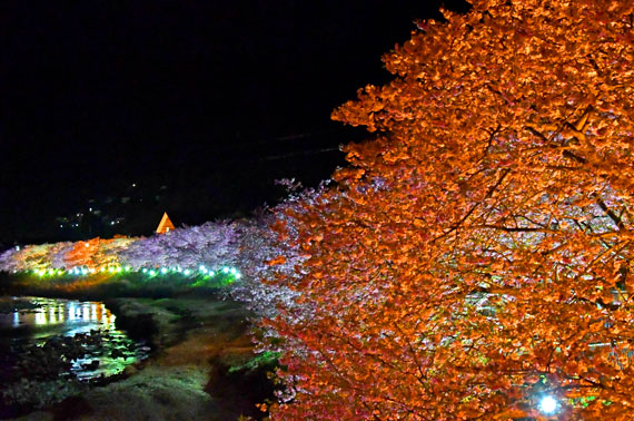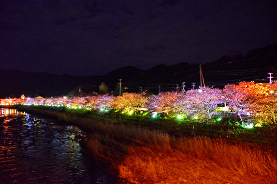 例年、ライトアップされているのは川沿いの一部のみ(主に、上流側のかわづいでゆ橋付近・下流側の浜橋から館橋・名木など)になりますが、昼間に比べると混雑もかなり少ないため、ライトアップもおすすめです。