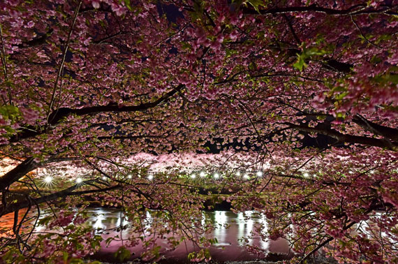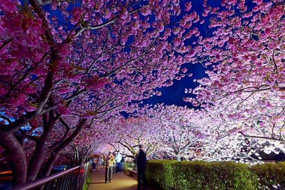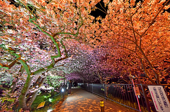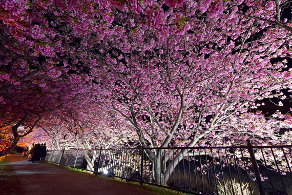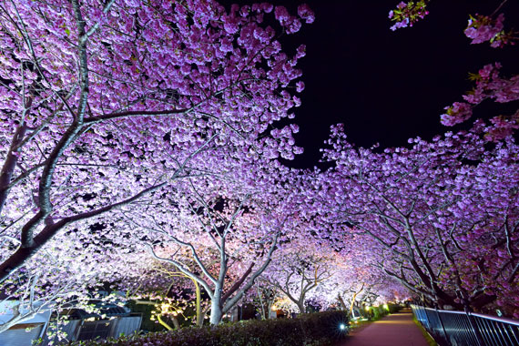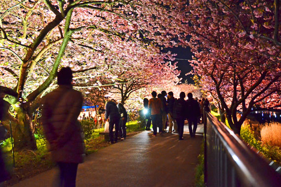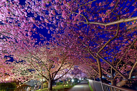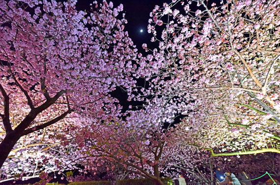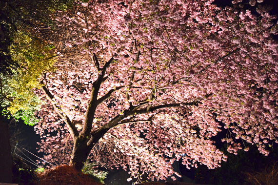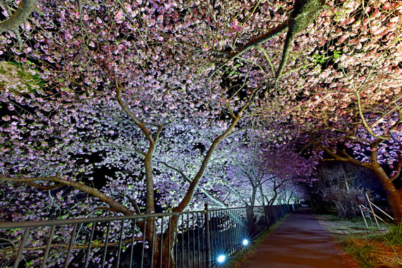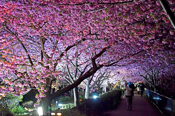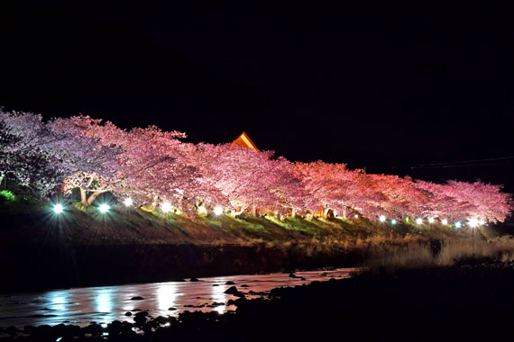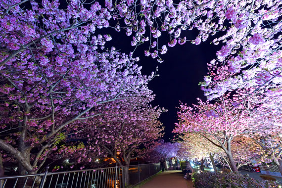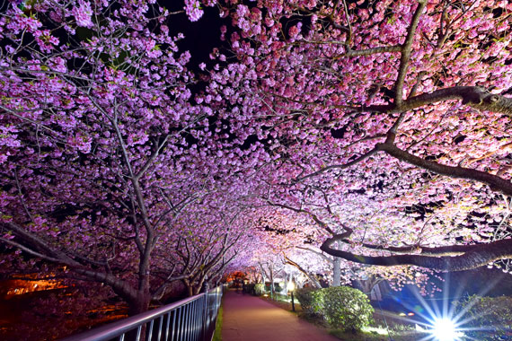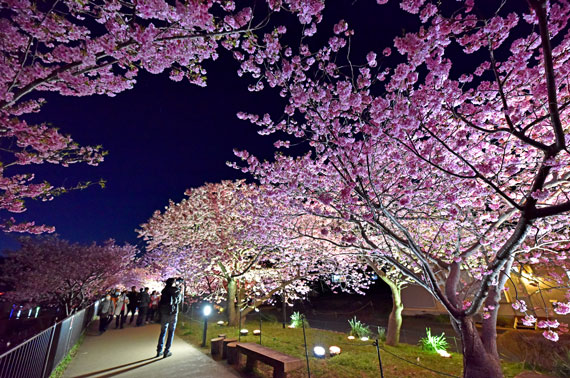 夜間には河津桜のライトアップも行っており、夜空に浮かび上がるピンク色の桜もとても幻想的で素敵です。