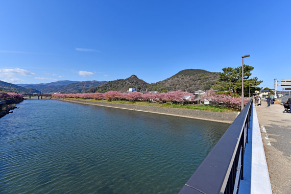 メインとなる河津川沿いは、海近くの「浜橋(下流側)」から「かわづいでゆ橋(上流側)」までが徒歩で約30分ほどの距離になっていて、その区間はずっと河津桜が続いています。