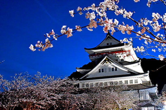 例年、5分咲き頃から庭園にある約50本ほどの桜がライトアップされ、見頃時期には桜とお城のコラボレーションが見事で、古来からの日本らしい桜の雰囲気を味わうことができる桜スポットです。