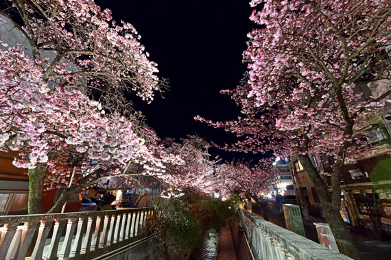 伊東の温泉街を流れる松川沿いにある「松川遊歩道」の夜桜ライトアップです。