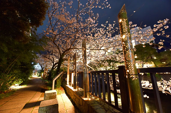 桜の本数はそれほど多くはありませんが、例年、竹灯りや夜桜のライトアップが行われ、竹灯りと桜のトンネルのような小径の雰囲気がとても素敵です。
