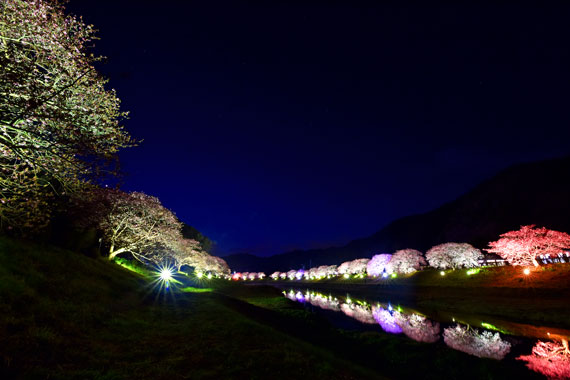 土手に咲く菜の花の黄色と、河津桜のピンクの色合いが美しい「みなみの桜と菜の花まつり」のライトアップです。