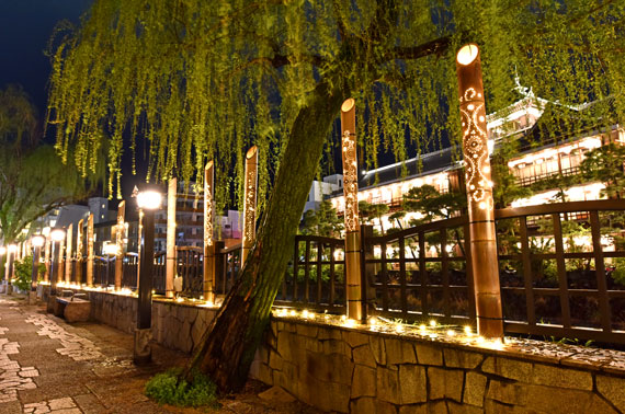 例年、竹灯りやライトアップが行われるほか、春以外でも枝垂れ柳や古き良き温泉街の情緒を楽しめる遊歩道になっています。