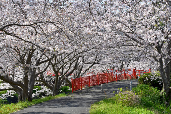 特に東側(県道16号側)、出会い橋(小さな赤い橋)から弓ヶ浜大橋までの歩道は桜のトンネルのようになっていて、伊豆の中でもトップクラスと言っても過言ではないほど素敵な桜並木といえます。
