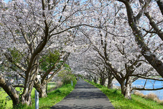 青野川の下流付近にかかる「日野橋」から「弓ヶ浜大橋」の間の堤防に、ソメイヨシノが約200本ほど並んでいます。
