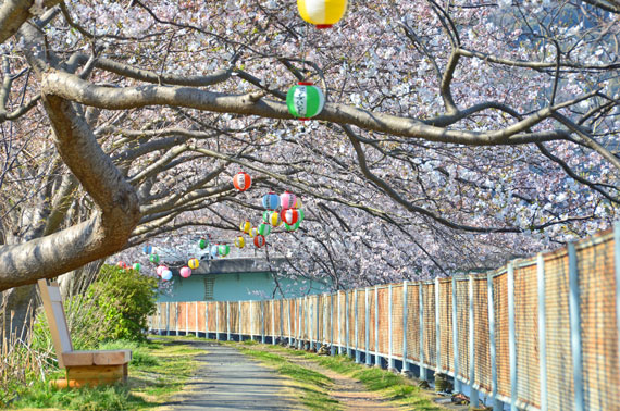 下田ロープウェイ乗り場付近から、稲生沢川沿い約730mにソメイヨシノが約270本ほど咲く本郷公園周辺の桜並木です。