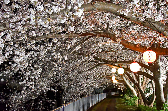 開花から見頃の時期には提灯などによる夜桜のライトアップも行われ、川面に映る桜がとても幻想的に浮かび上がります。