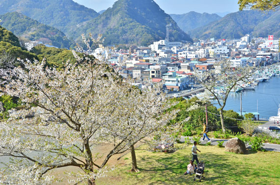 公園の散策路や展望スポットからは下田港や下田の街並みを一望することもでき、山のすぐ下には下田海中水族館やペリーロードなどの観光スポットもあります。