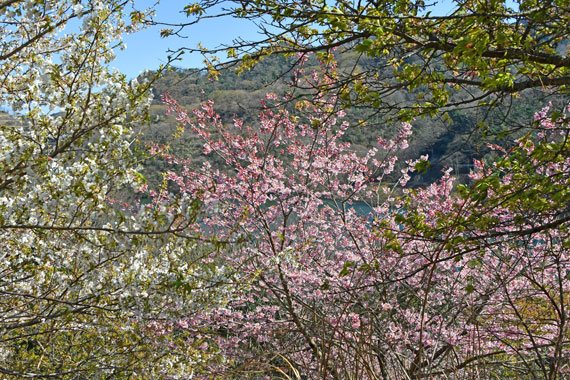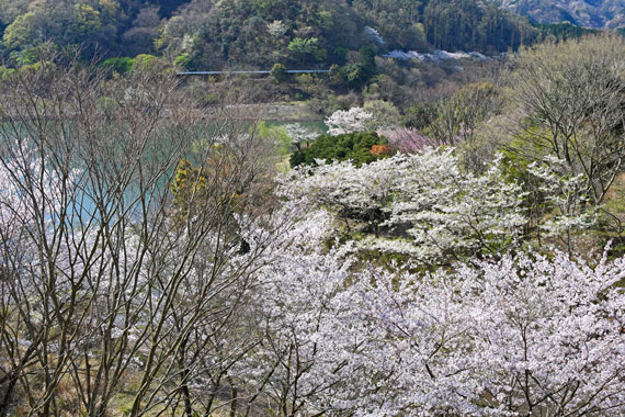 松川湖(奥野ダム)の湖周辺では、河津桜・城ヶ崎桜・ヤマザクラ・大島桜・ソメイヨシノ・八重桜など、時期によって様々な桜が咲いています。
