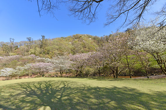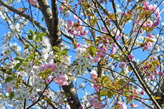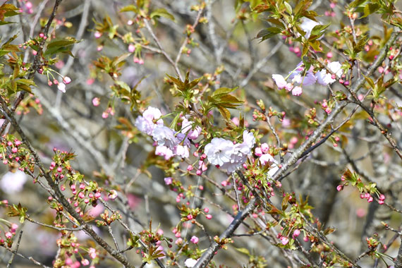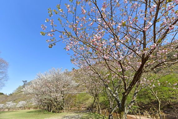 松川湖展望広場の周辺では、ソメイヨシノより少し早めに「大島桜」、少し遅めに「八重桜」などが例年見頃を迎えています。