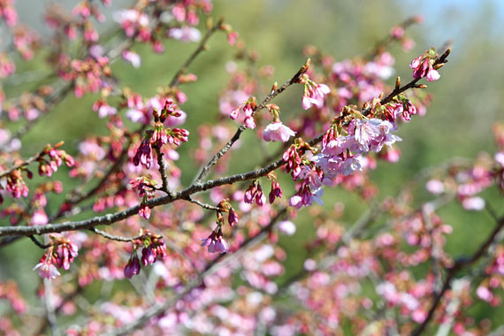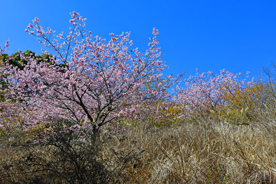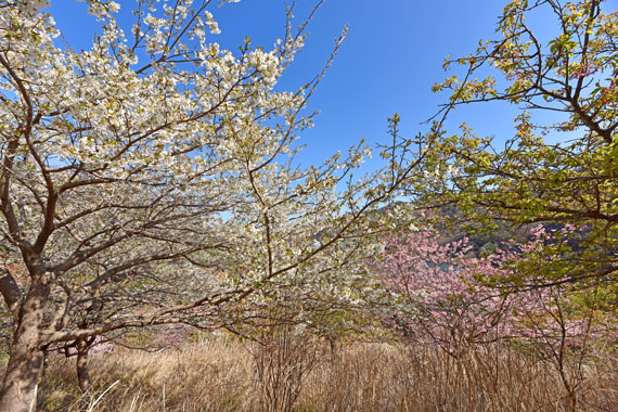 2月~3月頃に開花や見頃を迎える河津桜などの「早咲きの桜」は、主に奥野エコーブリッジの駐車場から徒歩で橋を渡った先や、中伊豆バイパスから松川展望広場に向かう道の途中などで見ることができます。