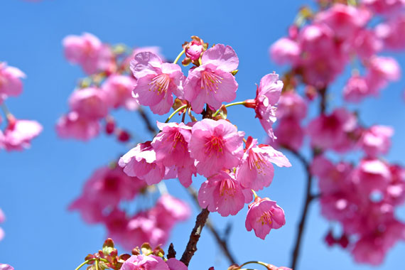 本州一の早咲きの桜として知られる「河津桜」は、例年2月上旬頃に開花し、約1ヶ月ほど楽しむことができる早咲きの桜です。