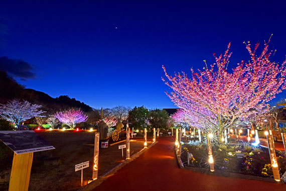 夜間には河津桜のライトアップも行っており、夜空に浮かび上がるピンク色の桜もとても幻想的で素敵です。