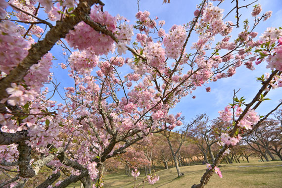 さくらの里は、大室山の西側山麓40,000平米の広大な敷地にあり、9月から5月まで次々と様々な種類の桜が開花します。
